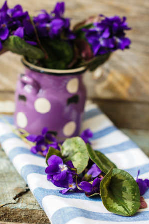 Saintpaulia,Purple African violet in a flowerpot on the background of wood planks
