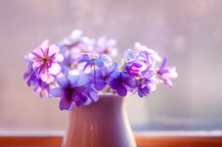 Forest Violaceae covered by dew. First spring flowers shooted close-up with selective focuse. Beautiful abstract spring floral background.