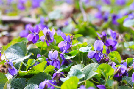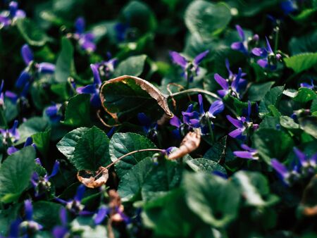 Many small delicate blue flowers of Viola odorata plant, commonly known as wood, sweet, English or florist's violet in a garden in a sunny spring day, beautiful outdoor floral background