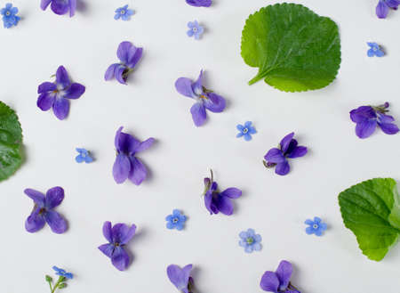 Mother's Day. A greeting card with purple spring flowers. Top view of small violets and leaves. Beautiful spring design, flower frame, creative composition. Women's Day, March 8. Flat lay, copy space