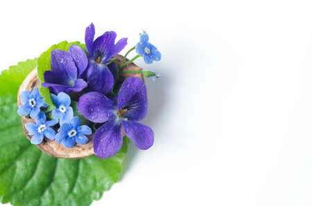 Floristic composition with violets and forget-me-not flowers in a nutshell against beautiful bokeh background.