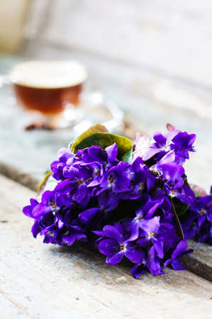 First spring flowers of violets and cup of coffee on the old wooden table