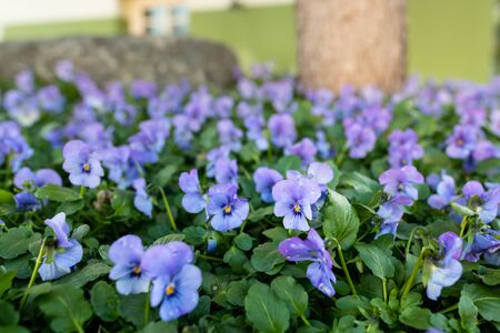 Beauteous bright violet flowers of tufted pansy blossoming with green leaves in flowerbed in garden. Gardening, postcard, botany, horticulture, nature concept. Close up, soft focus, copy space.