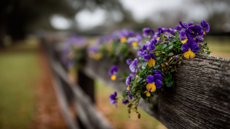 Lovely display of vibrant purple pansies with hints of yellow, resting on an aged wooden fence in a tranquil outdoor landscape.