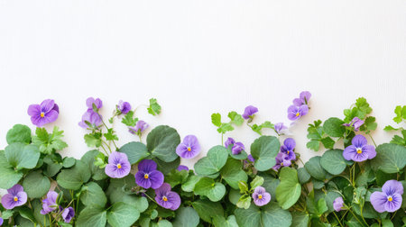This image features a captivating arrangement of vibrant purple violets intertwined with fresh green leaves against a clean white background, perfect for floral-themed projects.