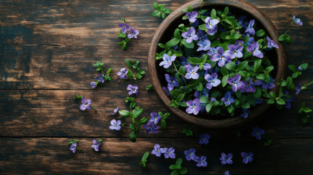 A stunning arrangement of fresh purple flowers in a wooden pot graces a rustic wooden table, creating a serene ambiance perfect for any peaceful setting.