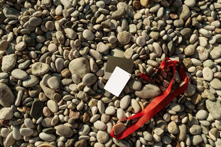 White balance cards outdoor. Gray and black plastic cards, professional photographer tools for color correction on a pebble beach