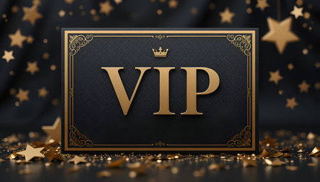 A inscription VIP in gold letters on a black background, premium VIP card with gold elements and crown,