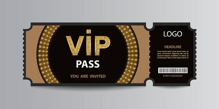 Stub black VIP admission ticket stub template with golden glittering VIP sign.