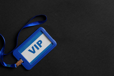 Plastic vip badge on black background, top view. Space for text