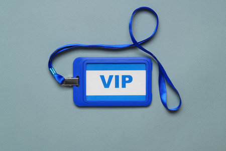 an id badge for a VIP event on a blue background, focuse on the vip text