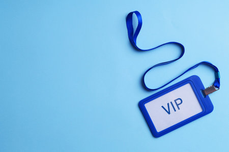 Plastic vip badge on light blue background, top view. Space for text