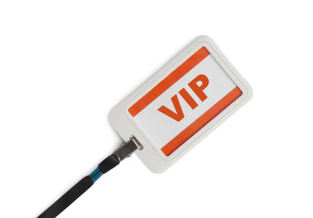 White plastic vip badge hanging on red background