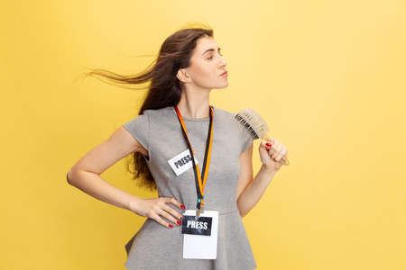Half-length portrait of young girl, correspondent holding reporter microphone isolated on yellow studio background. Concept of social media, press, news, information