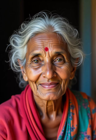 A joyful elderly woman from India sits peacefully in her home, adorned with a vibrant scarf and traditional attire. Her warm smile reflects a lifetime of stories and wisdom.