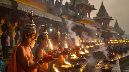 Ganges Aarti Festival. Priests and officiants guide the Ganga Aarti ritual, chanting mantras, offering prayers, and ensuring the proper conduct of the ceremony.