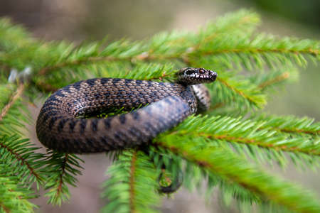Closeup snake poisonous viper in summer on branch the of tree . Vipera berus