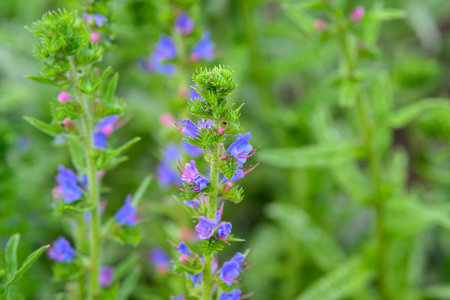 Echium vulgare vipers bugloss blueweed wild flowering plant, group of blue flowers in bloom on tall flowers stem, green leaves