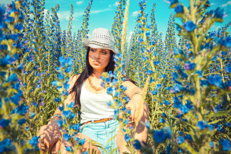 Beautiful cowboy woman with perfect hair and skin posing in country field with high grass