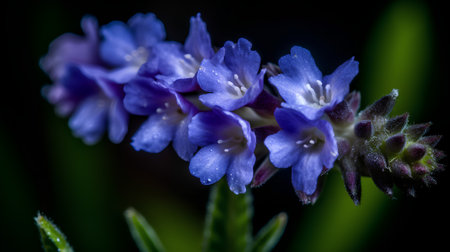 Macro shot of a blue flower on a dark background, shallow depth of field
