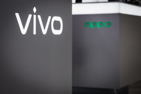 Close-up on the chinese brand VIVO and OPPO logo on a decorative wall in store. Almaty, Kazakhstan - April 15, 2023