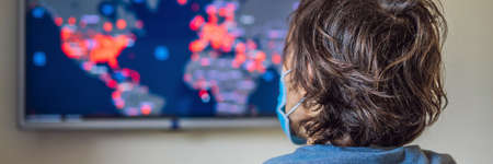 Young man checks coronavirus sars-cov-2 covid-19 global cases situation online. Coronavirus outbreak in United States of America and World BANNER, LONG FORMAT