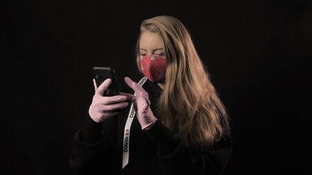 Girl with a white ribbon and the inscription covid 19 in red mask takes selfie on smartphone. Isolated on black background. Health care and medical concept. Coronavirus Epidemic