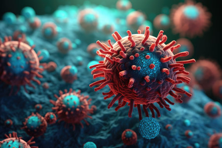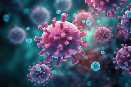 This vibrant 3D illustration showcases virus particles in a detailed microscopic view, highlighting their unique structures and textures against a blurred background, creating a dynamic visual experience