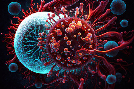 A vibrant and detailed visualization of a virus particle showcases the intricate structure and vibrant colors that represent the microscopic world of pathogens.