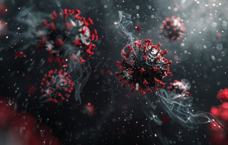 Digital illustration of macro Covid-19 cells floating with a DNA strain on red background. Coronavirus Covid-19 pandemic concept digital composite