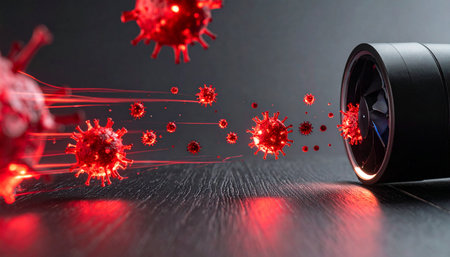 A powerful, futuristic air purification system uses advanced UV-C light technology to capture and neutralize dangerous airborne virus particles.