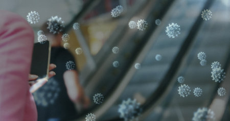Image of cells floating over caucasian woman using smartphone, walking on an escalator. coronavirus covid-19 pandemic concept digital composite