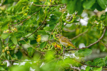 Cute Tennesee warbler songbird perching in a tree in Iowa in early autumn.