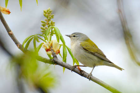 Cute little Tennessee Warbler perched on a branch in Spring.