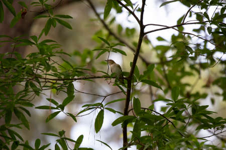 Common tailorbird's chick is taking stretch on a tree branch