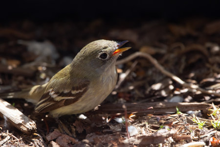 Little Least flycatcher is sitting on garden mulch in spring with open beak.