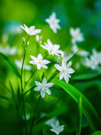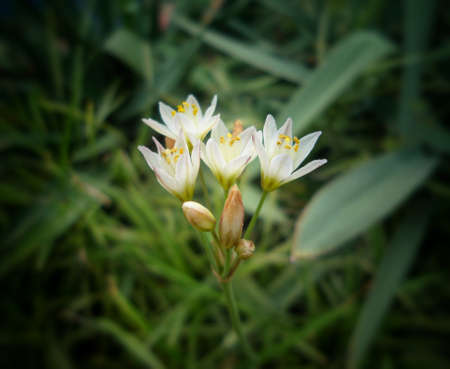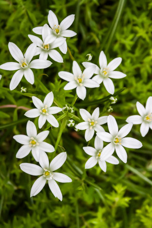 Spring garden flowers. Small bush plant star of Bethlehem or Grass Lily or nap-at-noon (Latin: Ornithogalum umbellatum) close-up. Selective focus. Shallow DOF.