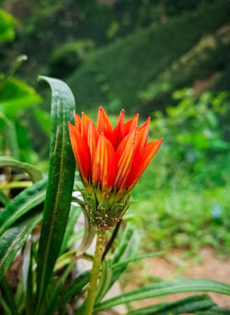 Beautiful closed orange flower next to a long green leaf. Sepals and stem covered with dust and dirt. Mountain background with coffee agriculture.