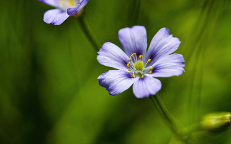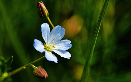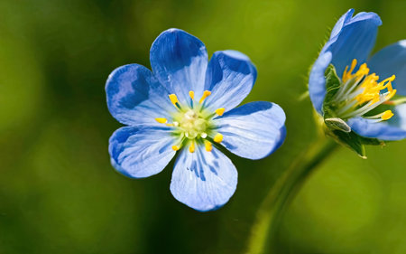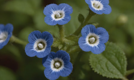 blue delicate flowers in green foliage in Botanical garden, floral background
