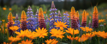 A golden sunrise illuminates vibrant lupine flowers, with a soft focus creating a tranquil and dreamy atmosphere in this serene natural landscape