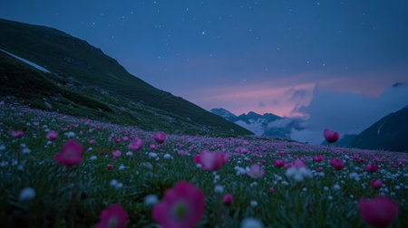 A vibrant field bursting with delicate pink flowers stretches towards majestic mountains, creating a stunning contrast between natures beauty and rugged peaks.