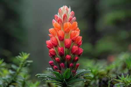 Illustration of in the lush green forest, an orange indian paintbrush flower blooms in full bloom, its vibrant red petals standing out against the backdrop of dense foliage. in the style of focus on face.