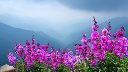 A breathtaking view of vibrant purple flowers in the foreground set against a dramatic mountain backdrop with clouds and mist, perfect for nature enthusiasts and photographers.