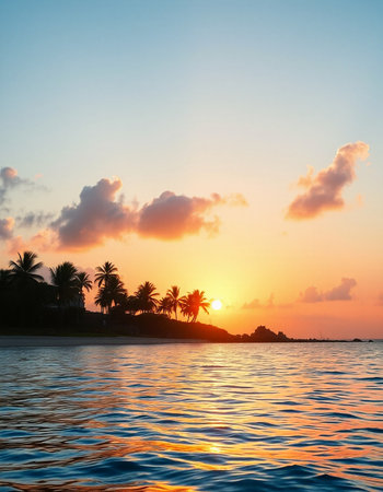 A serene beach showcases vibrant turquoise waters lapping at golden sands. Tall palm trees sway gently in the warm sun, creating a peaceful tropical atmosphere perfect for relaxation and serenity.