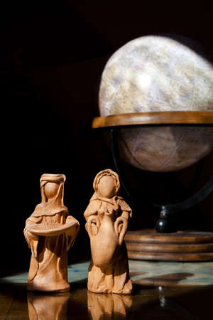 beautiful ceramic figurines of the mother of God joseph and baby jesus for the nativity scene on a dark brown background