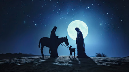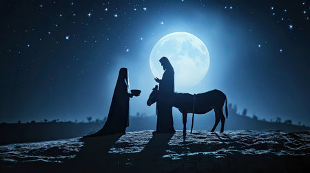 Christmas religious nativity concept: Silhouette pregnant Mary and Joseph with a donkey on night background --ar 16:9 --v 6 Job ID: 1811d471-94f1-4021-9a69-5e91ed3f4cdd
