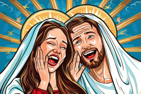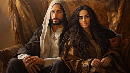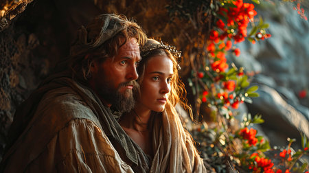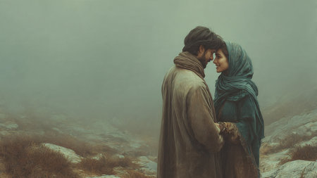 Mary and Joseph share a tender embrace, radiating warmth and love against a softly blurred backdrop, capturing a moment of deep emotional connection.