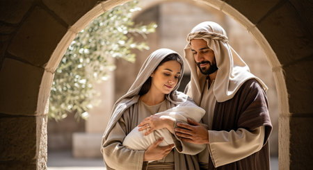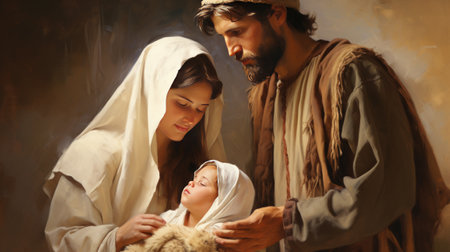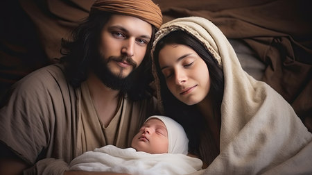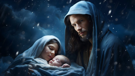 Mary and Joseph hold their precious child, Jesus, in a symbolic scene of the nativity. This image captures the sacred essence of Christmas and the miracle of Christ's birth.