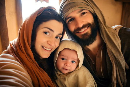selfie style portrait of Mary and Joseph with baby Jesus. Religious Christmas nativity scene