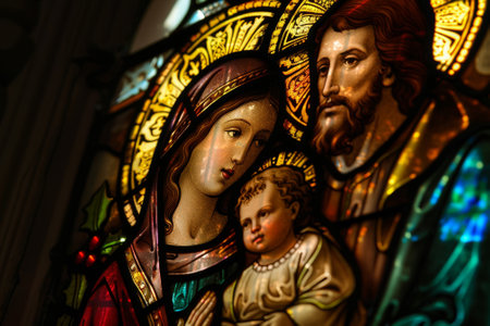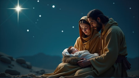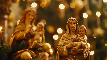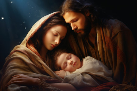 Nativity Scene with Mary, Joseph, and Baby Jesus. Symbolic Christian Christmas with spiritual and festive atmosphere.